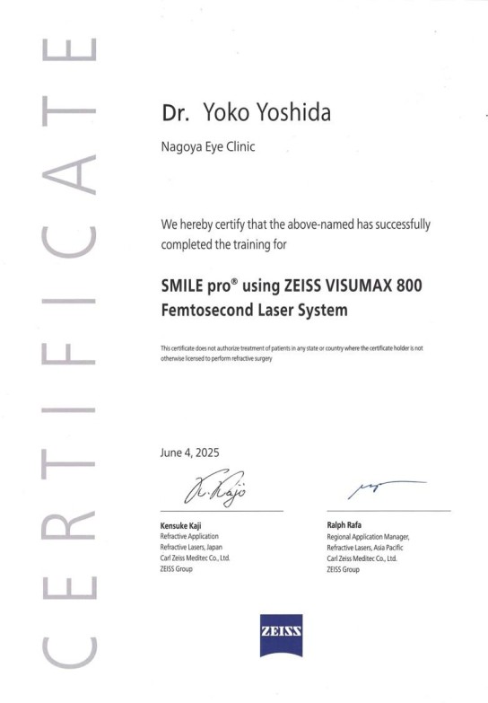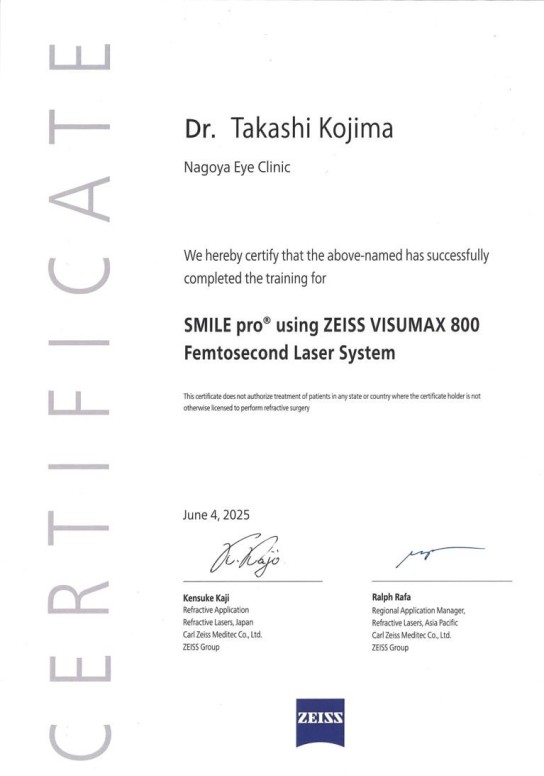 本証書は、ZEISS社のVISUMAX 800を用いた SMILE proに関して、